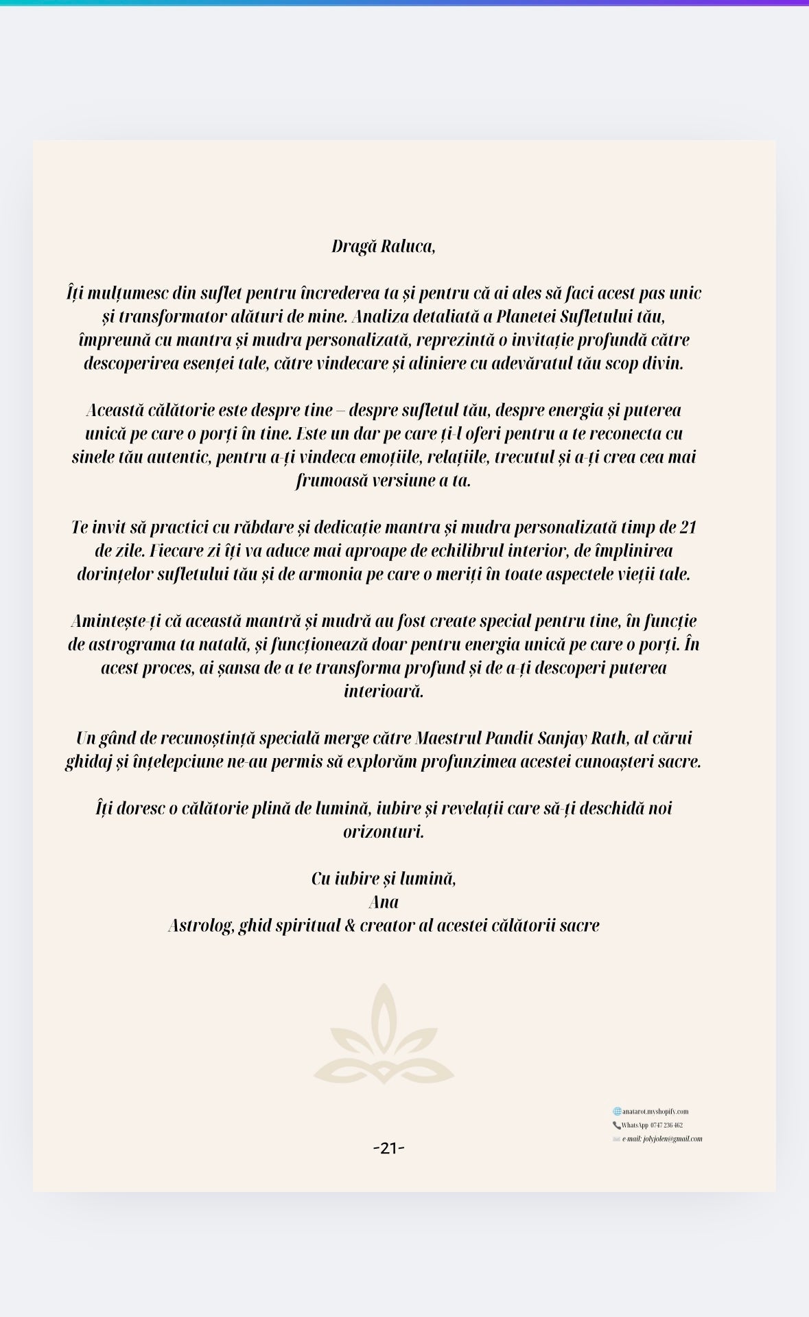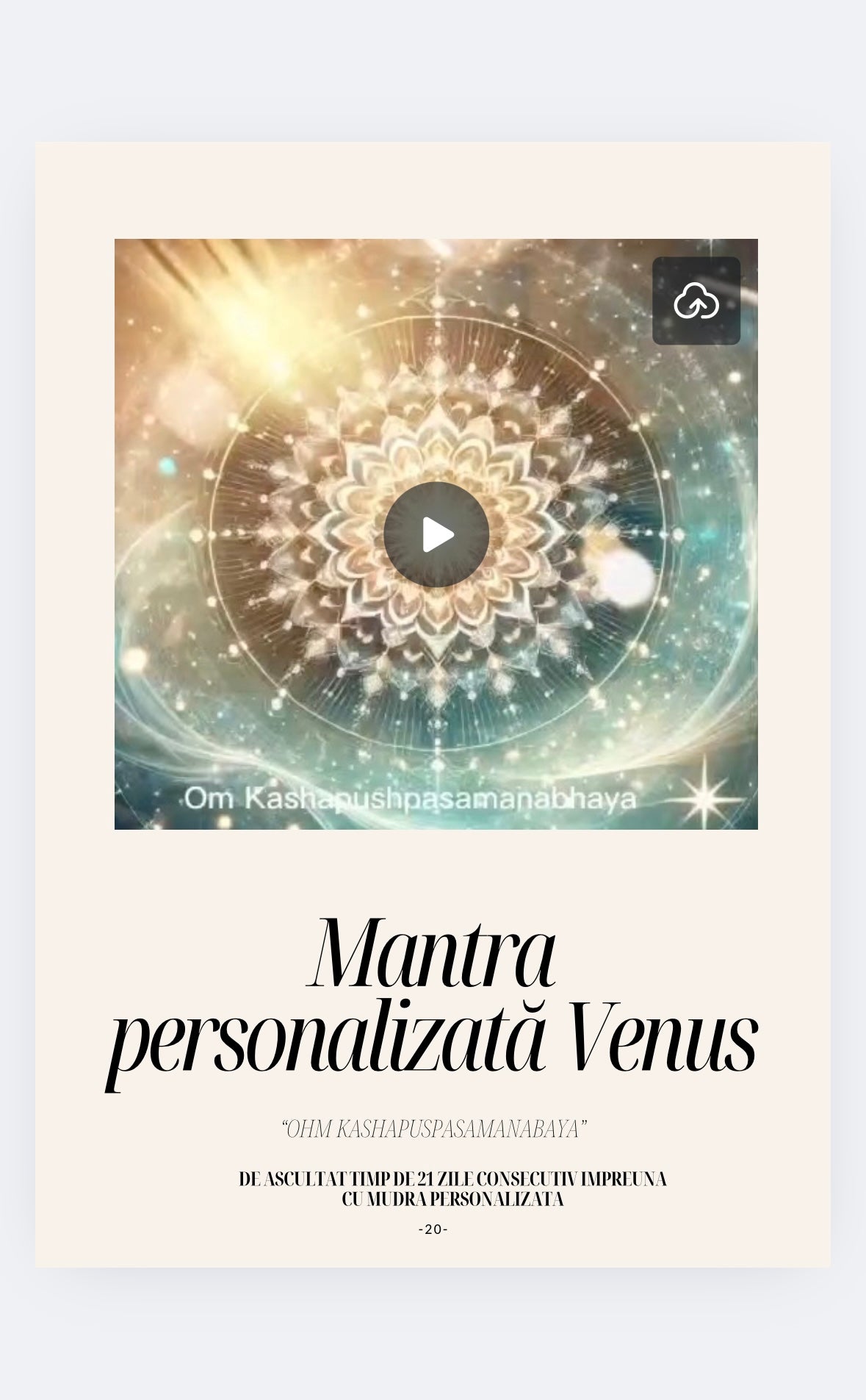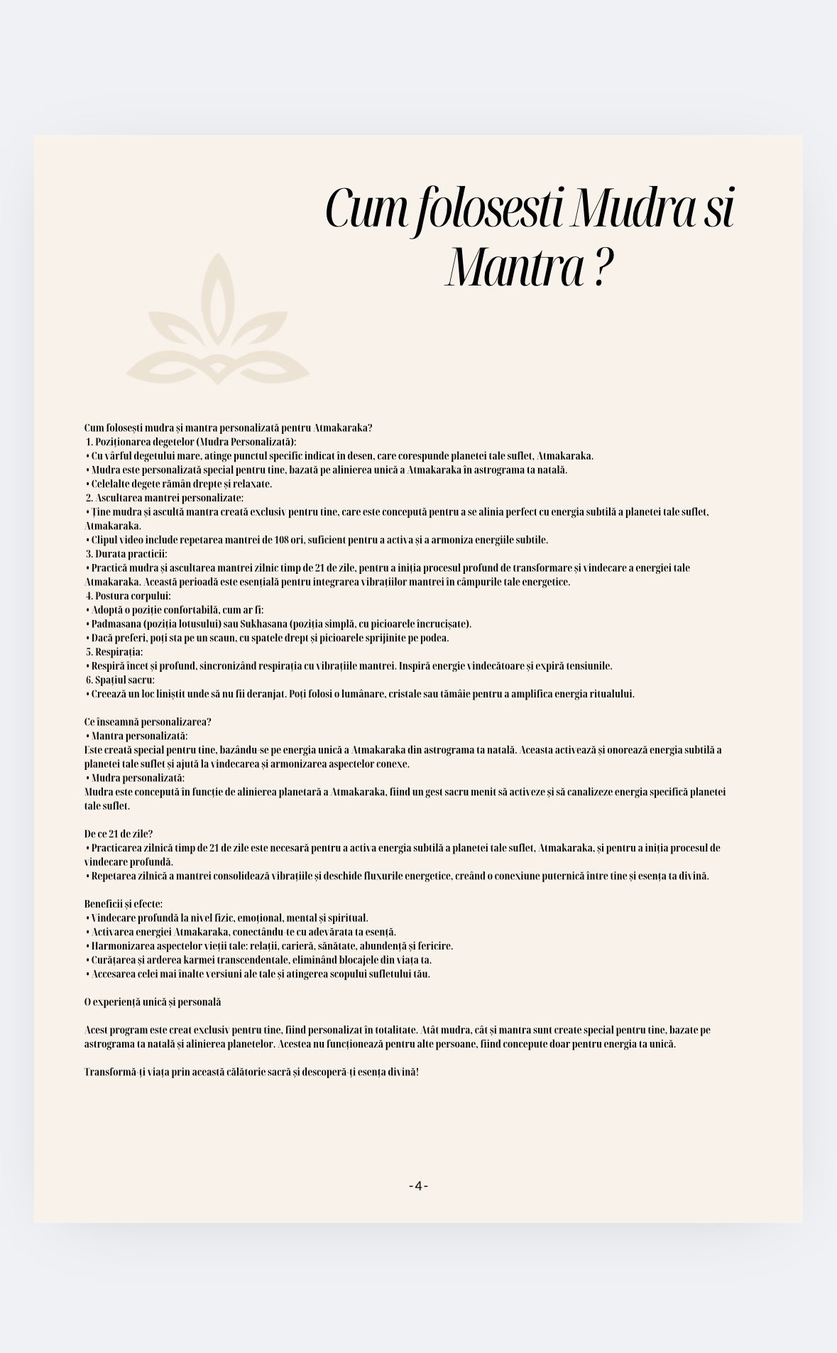 • Programul include un video personalizat cu mantra ta, repetată de 108 ori, pentru efecte maxime.