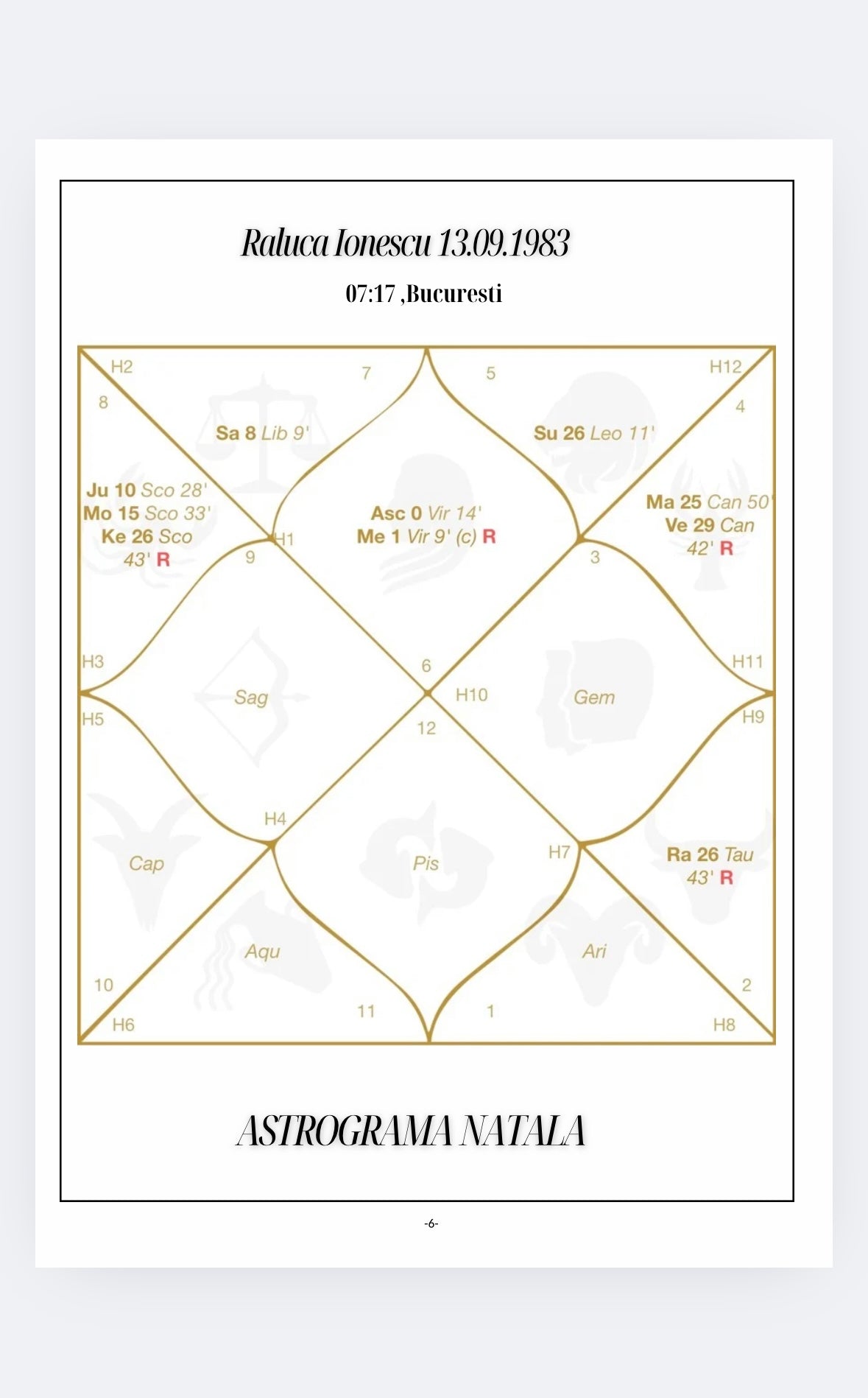 • În cadrul analizei, se explorează karma transgenerațională, tiparele care necesită vindecare, tendințele și obstacolele karmice ce influențează viața ta actuală.