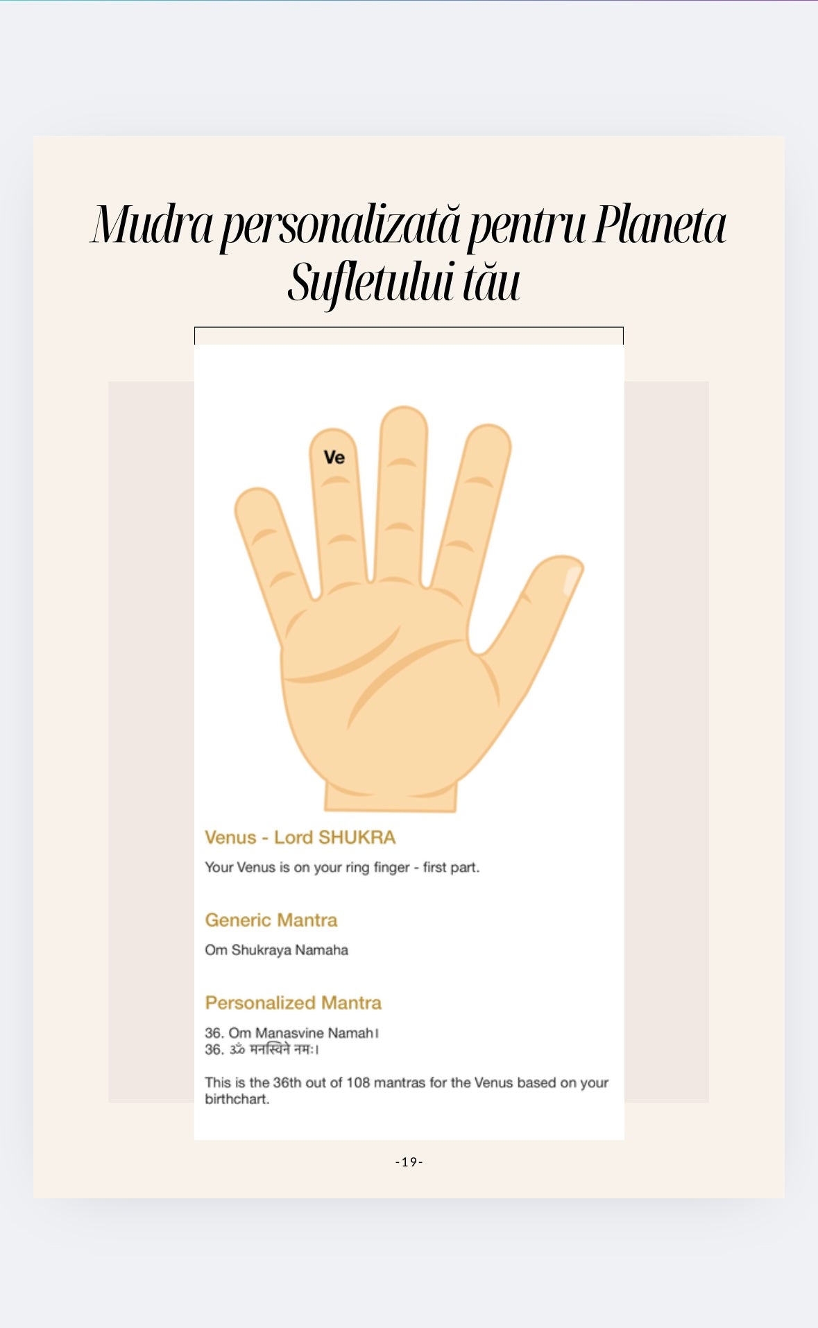 Acest program unic și profund personalizat îți oferă oportunitatea de a te conecta și de a vindeca energia Planetei Sufletului tău, cunoscută sub numele de Atma Karaka, printr-un set complet de practici sacre: Mantra și Mudra personalizate.